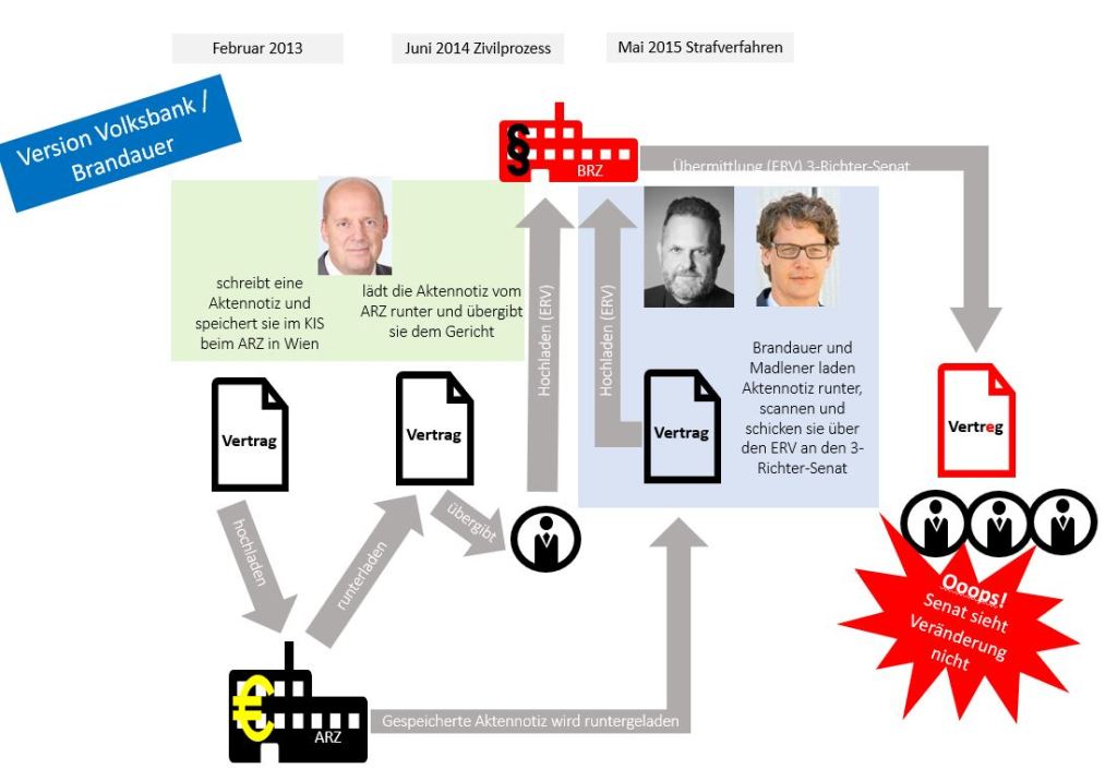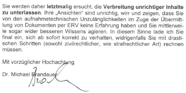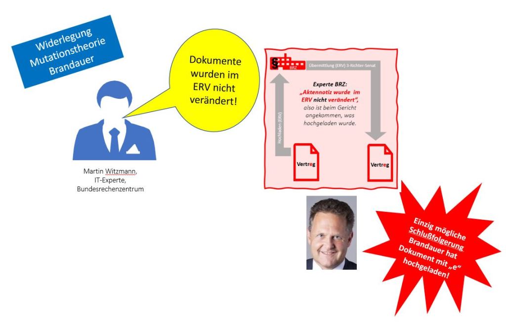 In diesen Eingaben liefert Brandauer eine Erklärung dafür, wie die Differenzen zwischen den beiden Dokumenten entstanden sein sollen. Der ERV sei schuld, die Differenzen seien einzig und allein auf die Übertragung im elektronischen Rechtsverkehr, der über die hochsicheren Server des Bundesrechenzentrums in Wien abgewickelt wird, zurückzuführen.