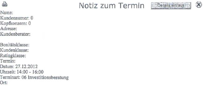 - Die Kopfzeile ist kein homogener Block, sondern wahrscheinlich aus drei Einzelelementen rund um die Überschrift „Notiz zum Termin“ zusammengestoppelt. „Druckersymbol, Detail ein/aus sowie das X“ sind offenbar „gesnippt“. Gesnippt heißt, irgendwo elektronisch ausgeschnitten und mit Copy/Paste auf dem Formular eingefügt. Auch die Überschrift ist hanebüchen. Bankmitarbeiter haben nicht nur Termine, sondern auch Telefonate oder ihnen fallen andere Dinge auf, die sie als Aktennotiz festhalten. Die aufzählenden Kategorien links ähneln mehr einem huschhusch hingefetzten Worddokument als den professionellen Rubriken in einem KIS, die eine speditive Suche und Sortierung erlauben.