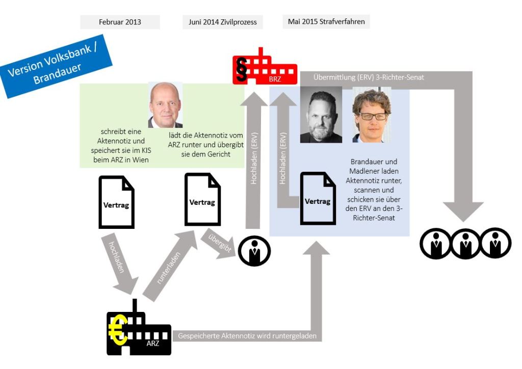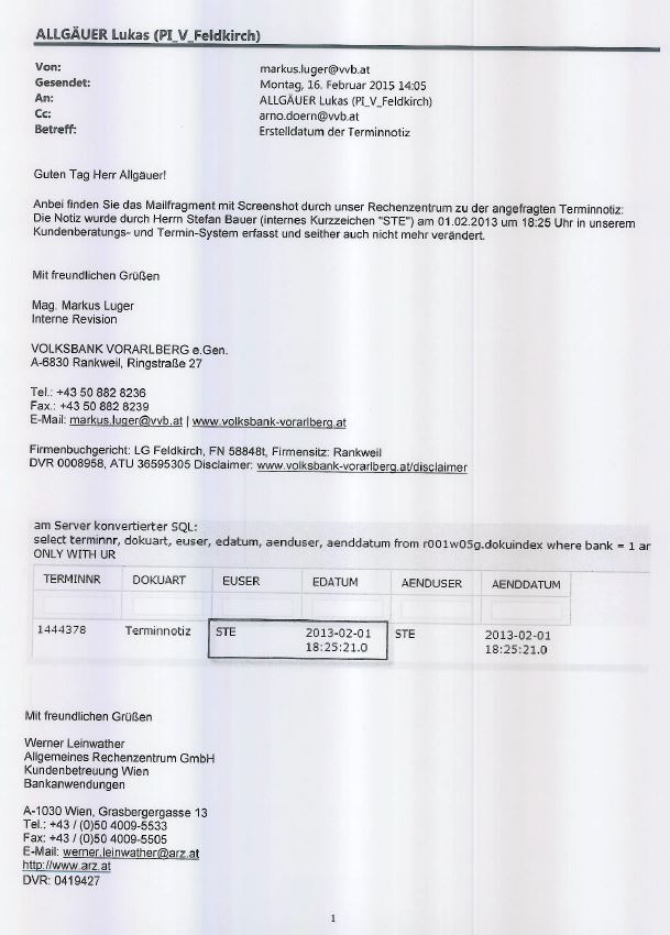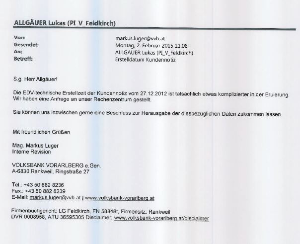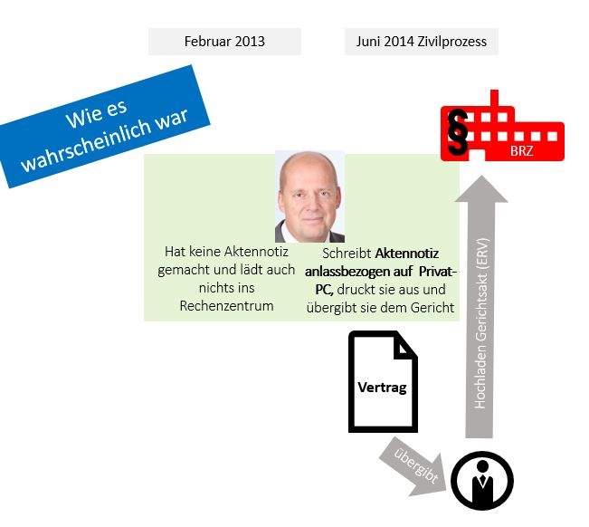 Zu dieser Aktennotiz sagte der Bankprokurist vor Gericht aus, er habe diese unmittelbar nach der Besprechung mit dem Geschäftsführer der klagenden Firma angefertigt. Die Besprechung fand am 27. Dezember 2012 statt, die Aktennotiz wurde laut seiner Aussage am 1. Februar 2013 vom Prokuristen erstellt und im KIS (Kundeninformationssystem) der Bank, das auf einem Server der Firma ARZ in Wien betrieben wird, abgelegt. Laut Aussage des Prokuristen hat er eineinhalb Jahre später für den Zivilprozess die Aktennotiz wieder von diesem Server abgerufen und ausgedruckt.