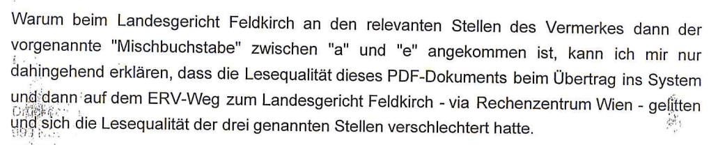 Tja, wenn diese Dokumente in Wien gar nie vorhanden waren, dann muss man sie halt in Vorarlberg produzieren. Zu blöd, dass einem jeder Maschinschreiblehrer an einer Handelsschule sagen kann, dass es bei Leuten, die im Tippen nicht geübt sind, sehr oft vorkommt, dass sie statt einem „a“ ein „e“ tippen.