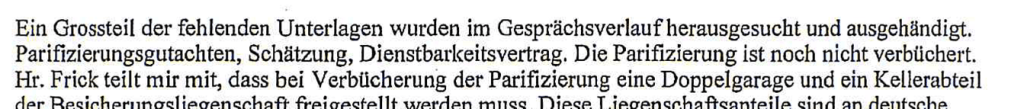 - Im Text der Notiz zum Termin hält der Bankprokurist fest, ihm sei im Rahmen der Besprechung ein Dienstbarkeitsvertrag überreicht worden. Nachdem es nie einen solchen gegeben hatte, konnte dieser auch nicht überreicht worden sein. Dieser dezidiert angeführte Dienstbarkeitsvertrag wird später hier noch eine gewichtige „graphische“ Rolle spielen.