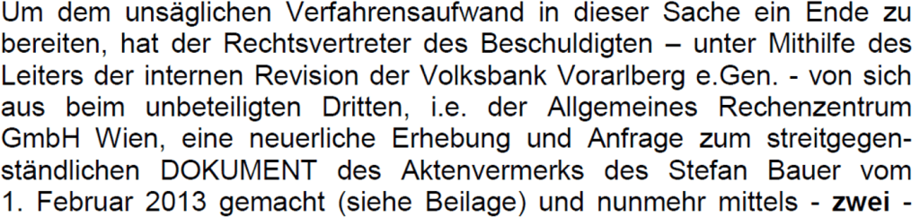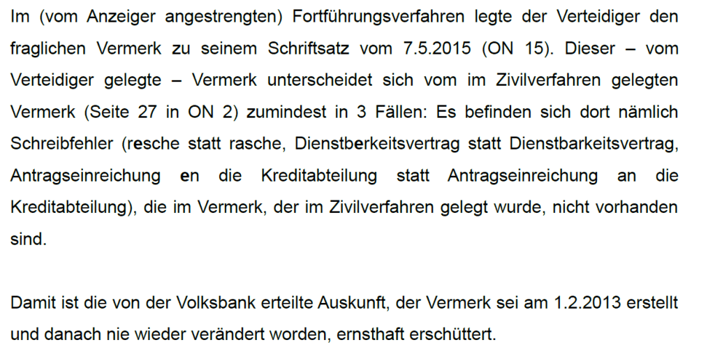 Ein der objektiven Rechtsfindung verpflichtetes Gericht hätte sicherlich die geforderten Überprüfungen in Wien veranlasst. Und genau das musste die Volksbank befürchten und deshalb erfolgte die „proaktiv caritative“ Dokumentenbeschaffung.