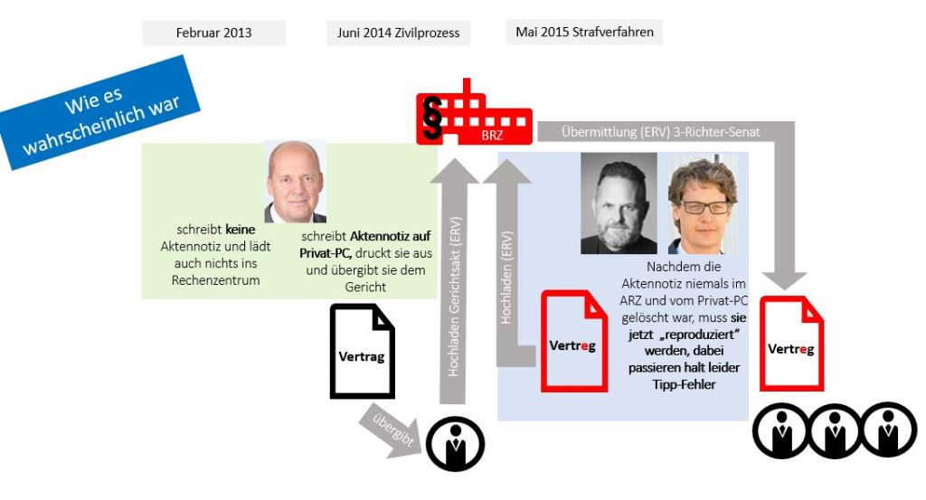 - Die beiden Dokumente sind nicht identisch, also kann sich die Aktennotiz von Bauer nie auf dem Server in Wien befunden haben. Die Aussage des Prokuristen Bauer im Zivilprozess wäre somit eine Falschaussage.